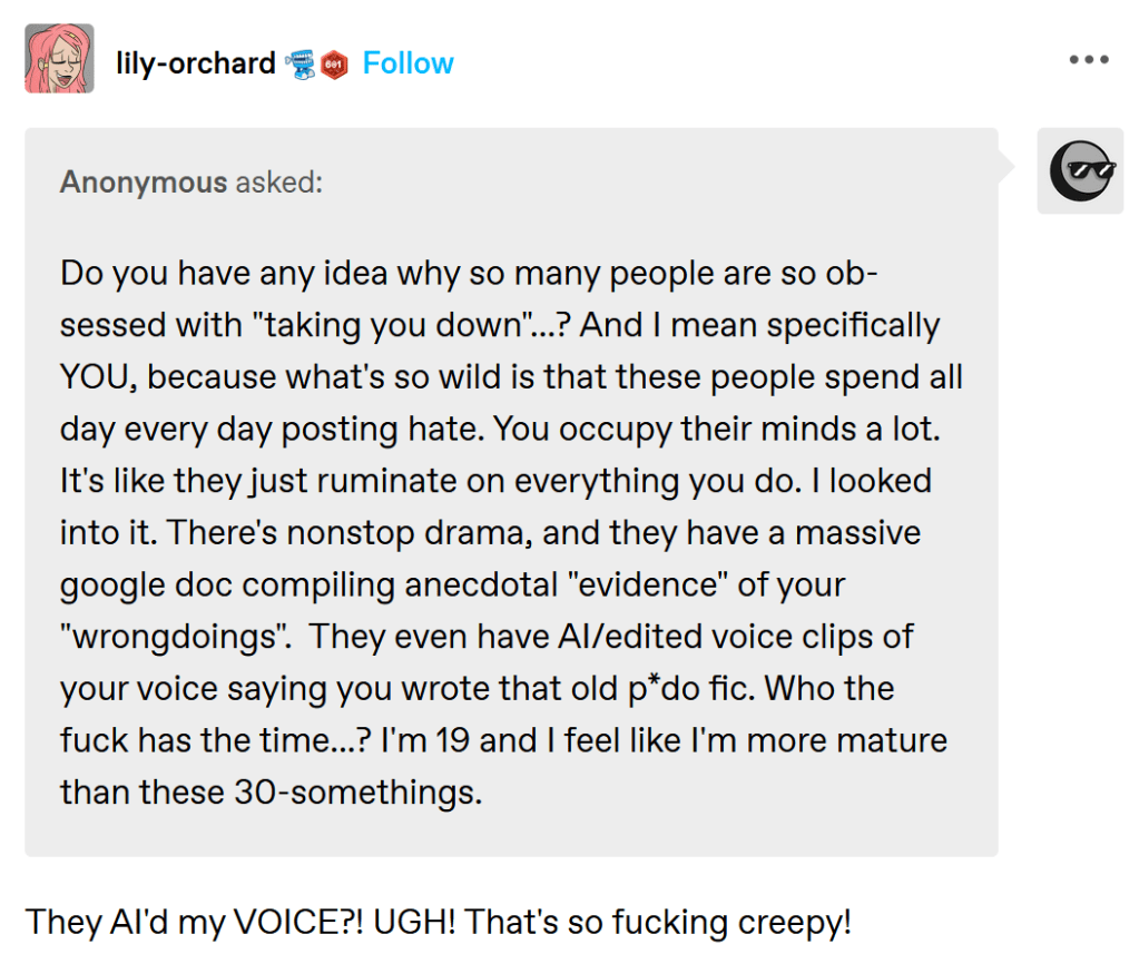 There was more to this post that I cropped out because it was just stuff I know nothing about. I just wanna talk about the AI voice thing. I’m already seeing a few “thats not me, its AI” in response to people digging up *actual* voice clips of people admitting to doing something. I know the clip they’re talking about and it was brought up long before using AI voices became prominent (saw it in an Essence Of Thought Vid). You totally wrote that shit then tried to back track since it didn’t suit your rebrand. Come TF On!