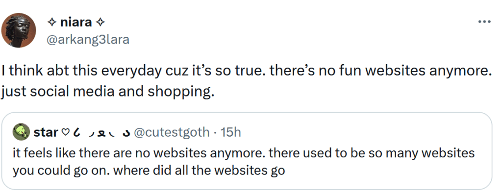 Tho most people leave these sites for a reason, I suppose. Social media has a bigger reach and is far more convenient. And as much as people complain, no ones really willing to give up the convenience even if it means giving up an actual community in favor of mindless scrolling and never talking to people. There are different websites out there (yea hi) but you’re gonna have to find them yourself. Its not going to just appear from passive scrolling. I don’t have much hope rn for people actually doing that. Most people can’t even stick to their guns when they say they’re leaving twitter for tumblr.