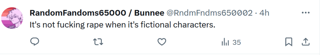 I hate this overly reductive bullshit argument. Its like what people jump to when they have no argument but don’t like people saying meany weeny things about the slop they enjoy. Its nice to see people still spouting this shit when they know they cant defend a piece of media in any other way. Normally I would say that people should be able to form a counter argument from analyzing the media instead of resorting to this shit, but in this case theres literally nothing to be said without sounding like a victim blaming stooge.