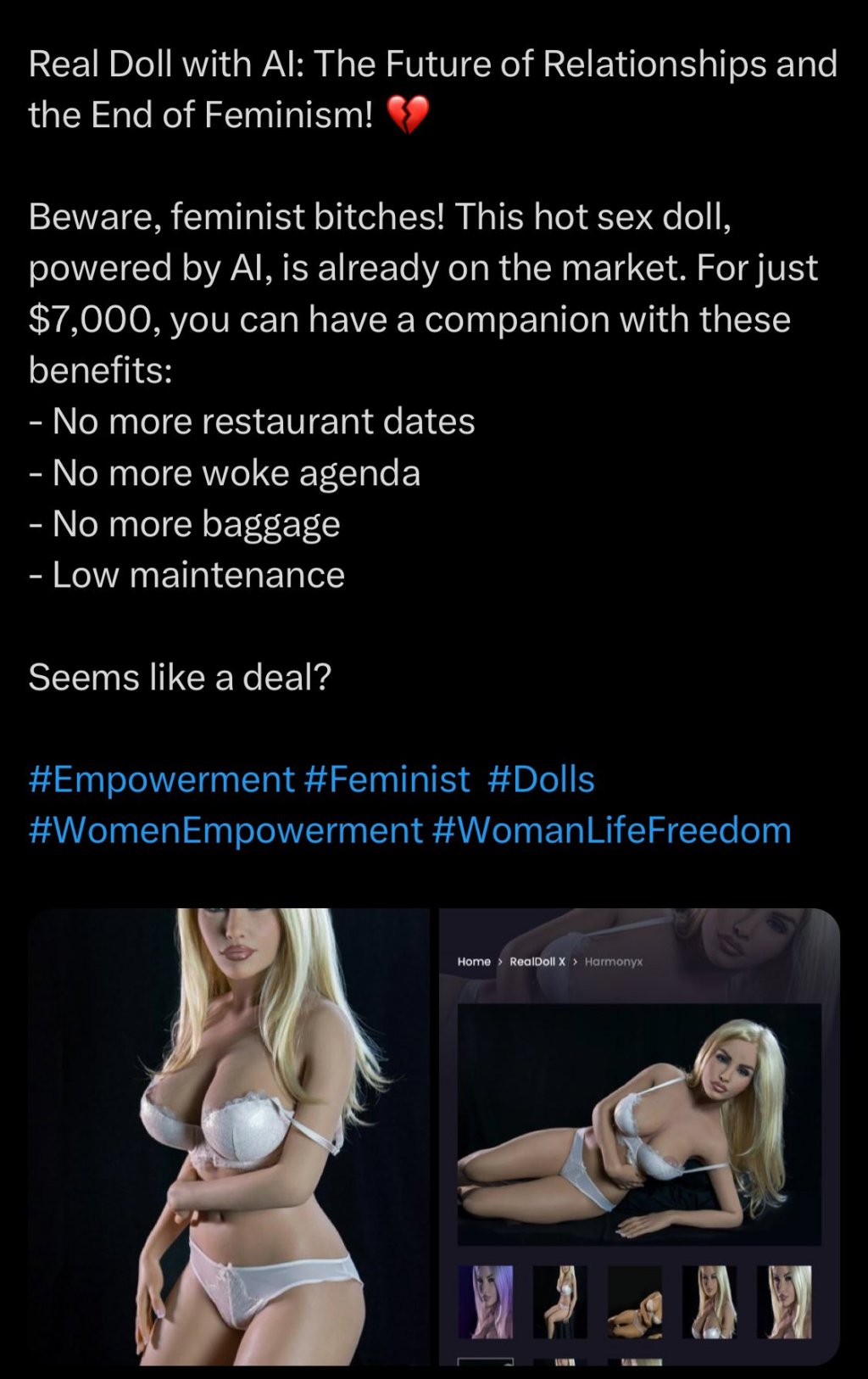 They’ve been saying they were going to replace women with robots for FUCKING YEARS. Seriously, go ahead and do it and leave us tf alone please! They acting like this is a threat women are sweating over. I wish ya’ll would keep to your word and permanently lock yourselves away in your basement with a doll never to be seen again.