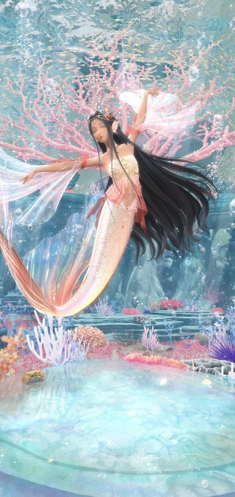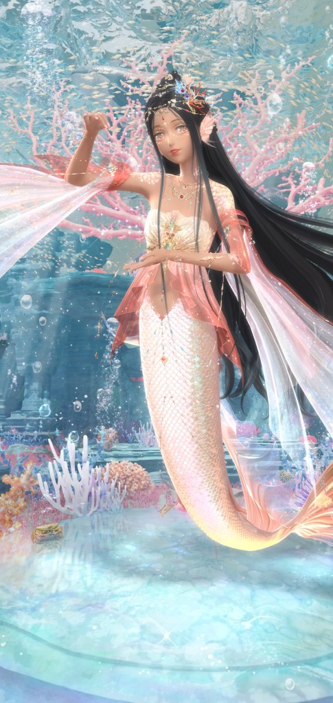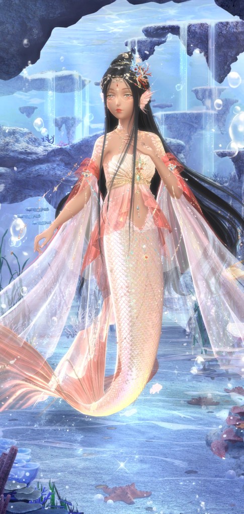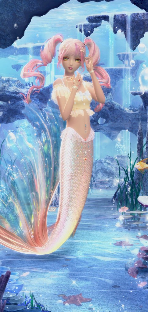 I GOT THE MERMAID! They know most people only want the mermaid tail so of course its the last item you can get *eyeroll*. So the the tail is a separate item of course. It looks gorgeous, her swimming animation is fantastic and I hope at least some of the money they siphoned from everyone goes into the designers and animator’s bonus. It feels like a return to the fantasy style suits they did in Love Nikki where she’d just straight up shape shift. I played around with it in game and it can be worn with almost any shirt, but you cant use this item with pants (duh) and dresses. Only tops and jackets. You can use any pose with it as well. I am pleased with the custom mermaid I created. Oddly enough theres a few hair styles I owned that have float-y underwater physics. The one I used above is Light Cruise, a recolor I felt worked better with the tail than the original. The other styles were too long and started to clip with the tail. Hopefully they’ll release more short float-y styles in the future ( and more underwater bgs).