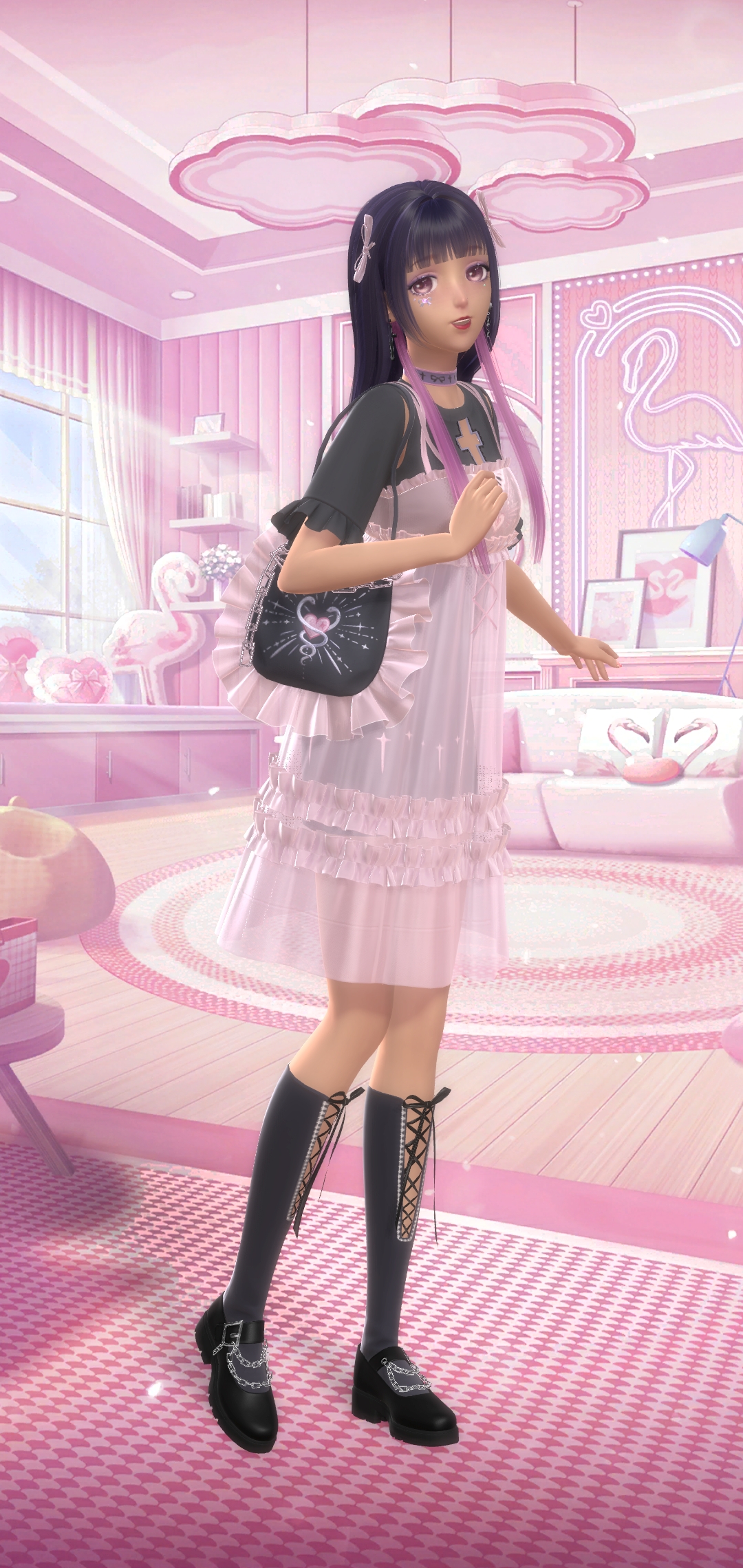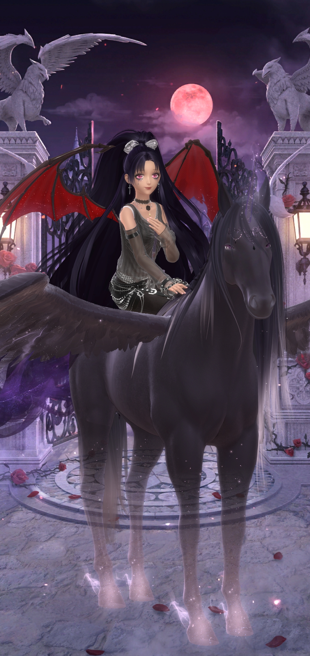 First up is Telosma’s Kiss, a free suit you can craft. I like the hair. Pink Field Of View is another craft suit. Its like a weird transition between Gods Girl and Goth Girl. Next is a recolor of the unicorn from Ad Lunam. The whole suit has a dark recolor but all I’m using is the horse. The rest of the suit is a mary sue I created. OP, full of mystique and ready to whisk away a cannon character on her flying telepathic unicorn.