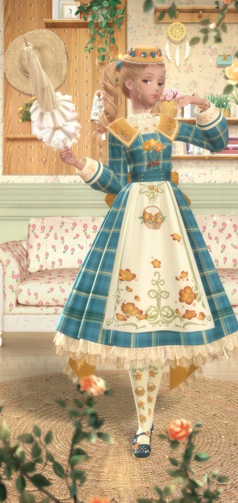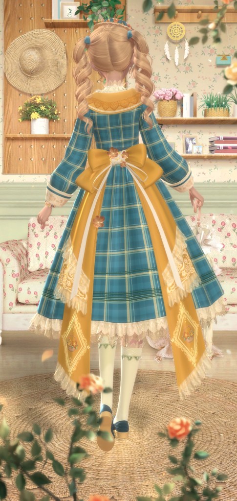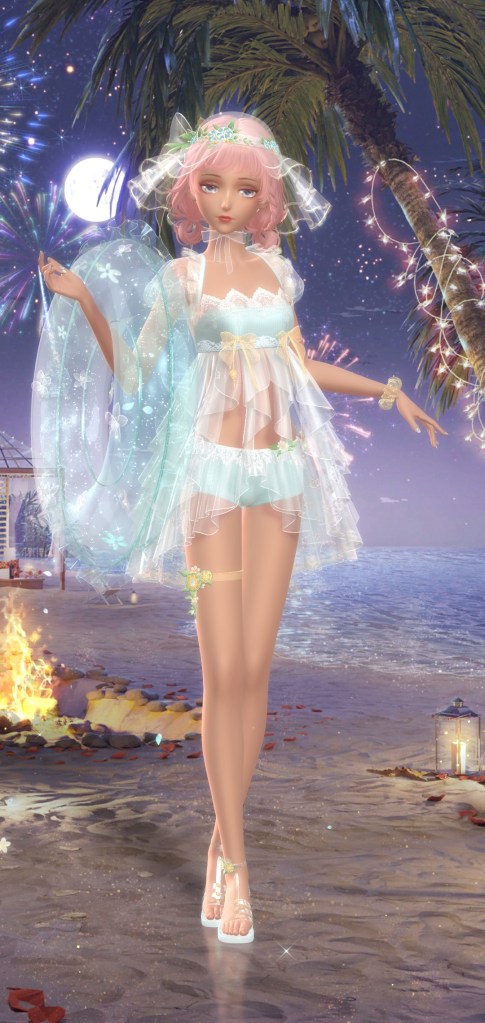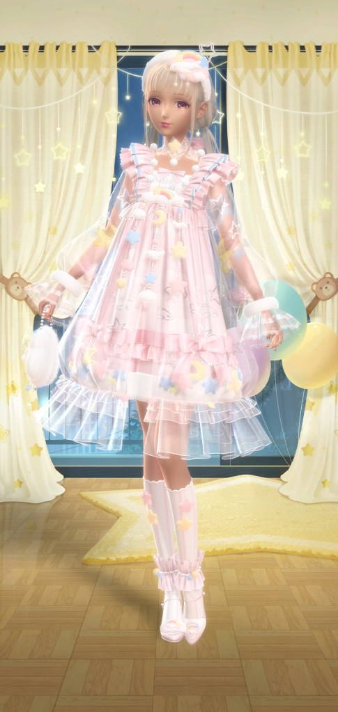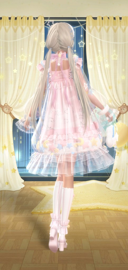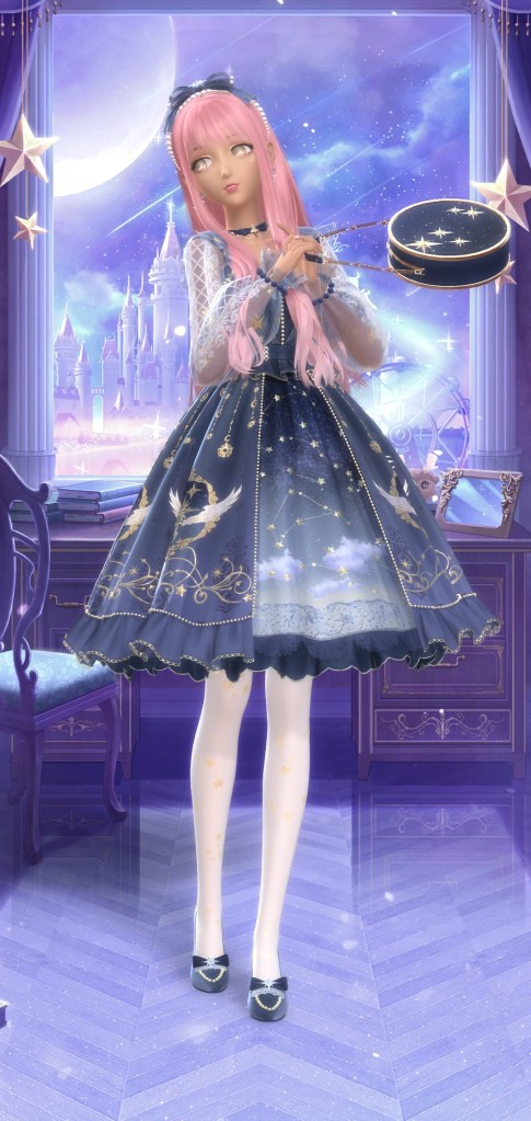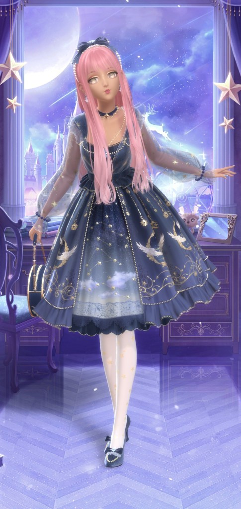 Next one is Latte Vacation, a free suit inspired by a cup of coffee. Its a cute idea but like most free suits I wouldn’t have gone out of my way for it. The next suit have Moonlight Dreams. Now this is a suit I would go out of my way for! Then again I think I’m a sucker for sparkly suits. They actually give you almost a month to complete this suit but if you’re playing everyday, you wont need *that* much time. About the second pic, theres a new feature where you can slightly adjust her hand position if shes holding an item and it works great until the items don’t have physics like the rest of the outfit. It does look like shes mid swinging it tho.