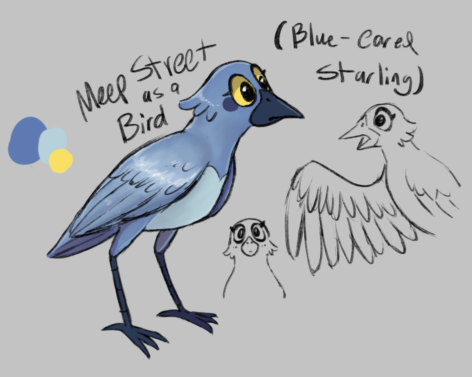 Did some lore doodles of Meep Street. She and RipTide hang out because they’re possessed by the same entity and have the same abilities technically. Riptide is a shapeshifting menace while Meep just never learned how to control her powers and sucks. All she can do is turn into a bird when she gets too spooked. And its not the bird people its a literal tiny bird. Based on a Blue-Eared Starling. Eventually I want to make a coherent character page for her and RipTide.