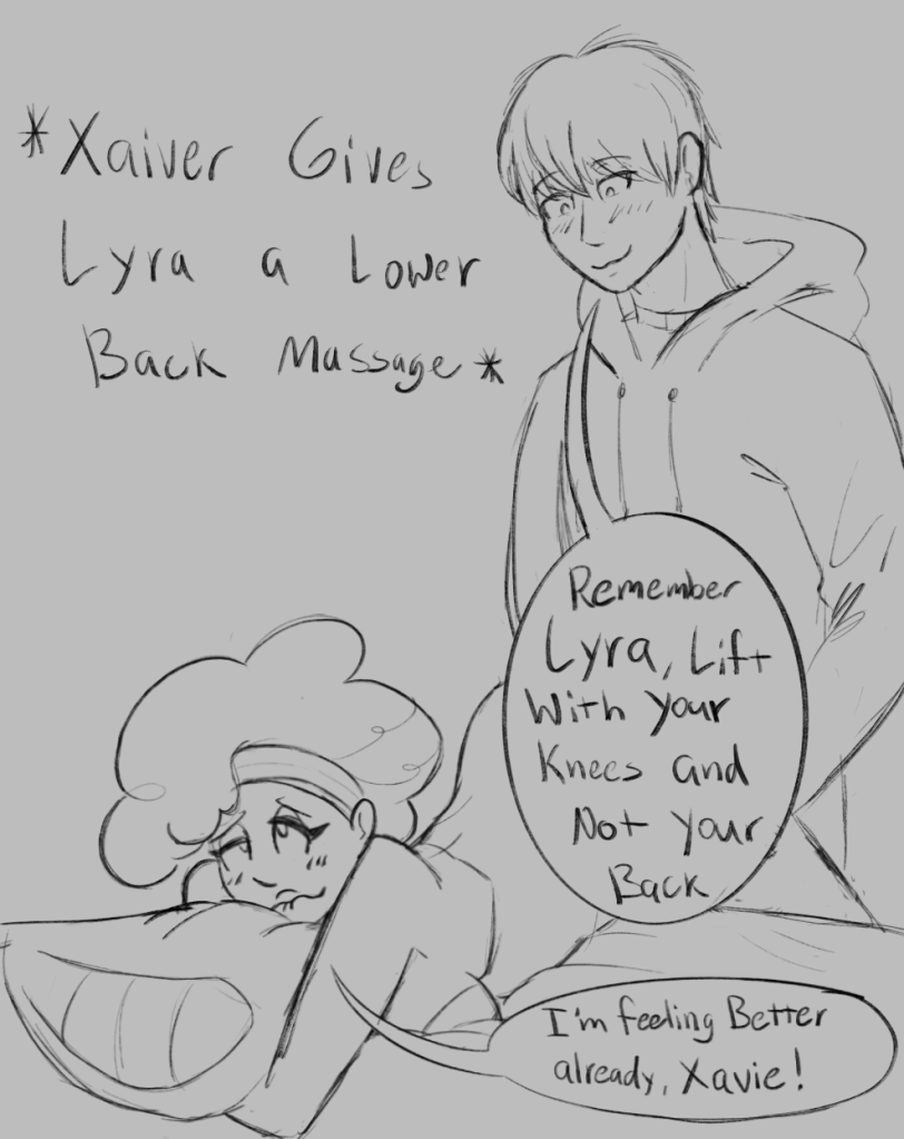 Now with that being said, heres a quick doodle of two of my favorite characters, Meep Street (A Rocket to the Stars) and Xavier (Love and Deepspace), hanging out. He’s giving her a back massage.