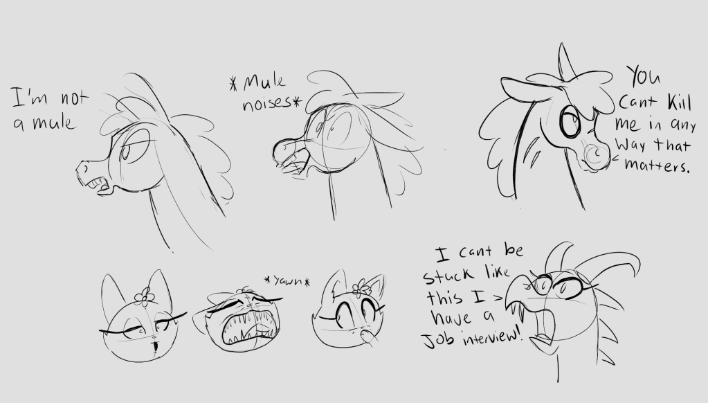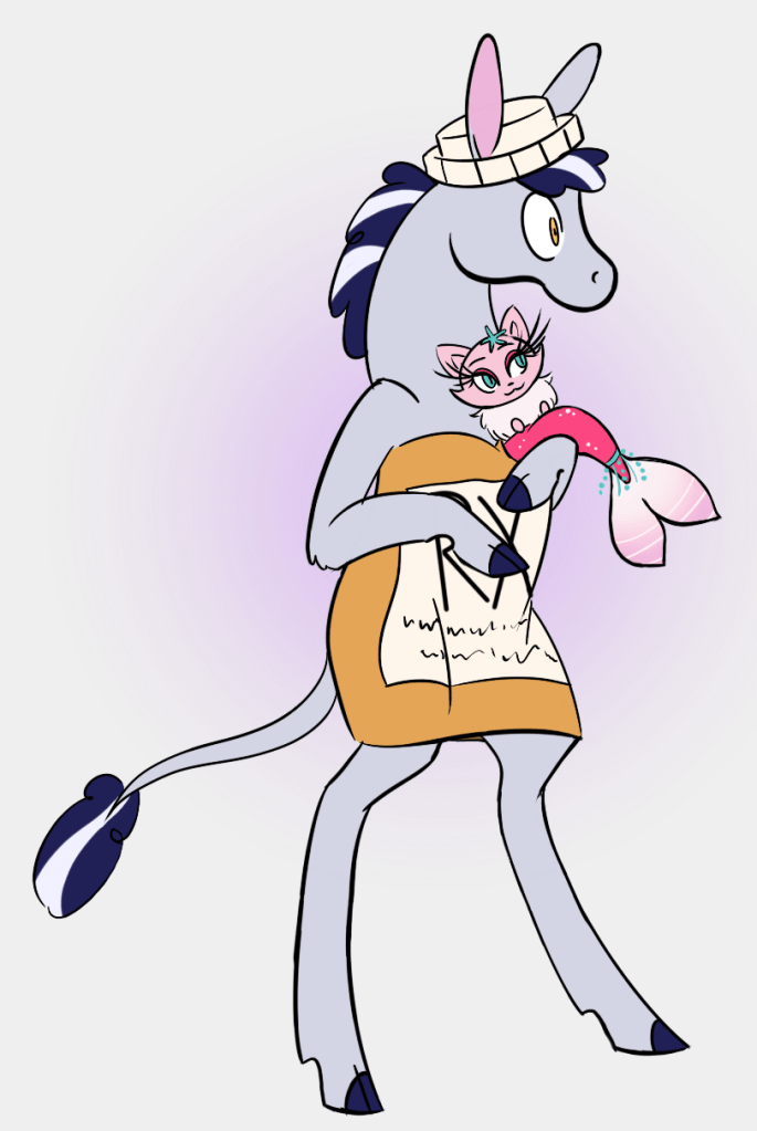 A unicorn that lost their horn a long time ago, so they’ve chosen to masquerade as a weird, sparkly mule. Comet adopted a cat and now lives a domesticated life within galloping distance to a small town. Because unicorns are uncommon enough to be considered a myth and mules aren’t supposed to speak, nearby citizens have just accepted Comet as a local cryptid that sometimes stops by.