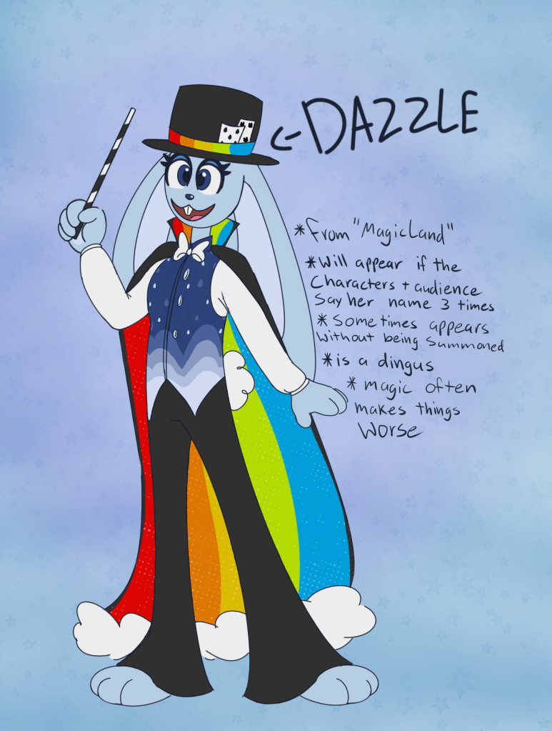 Her name is Dazzle and shes magic! Dazzle was meant to be the odd character in the show. She didn’t live in the neighborhood and would only show up if Wally (or anyone else) and the audience said her name three times. She is magic but she isn’t good at it. As in, other characters would ask her to do something or she’d try to help someone and completely botch it. Like if you wanted to go one week into the future she would somehow zap you back to dinosaur land. Dazzle would try to give Eddie a day off by casting a spell to make the mail deliver itself, but then it all just grows legs and runs off. She is a ditz.