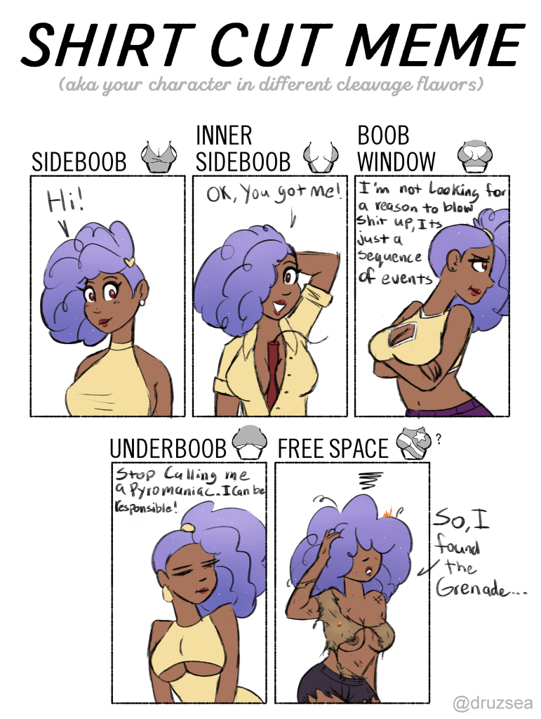 Lynda is a fire fae on Mu. She lives in an apartment inside an active volcano (theres a whole civilization in that active volcano) and is a hobbyist treasure hunter. Her real job is real estate agent. Lyn is generally an agent of chaos and a risk taker, possibly an adrenaline junkie. Being a magical fire fairy, she is naturally immune to fire, lava, intense heat, acid rain and volcanic fumes. Lyn is mildly uncomfortable in moderate temperatures and extremely vulnerable to the cold. Her wings are incorporeal and can be turned “on/off” and while she can fly, she’s not the best at it and a slight breeze could set her off course. Prone to setting things on fire.