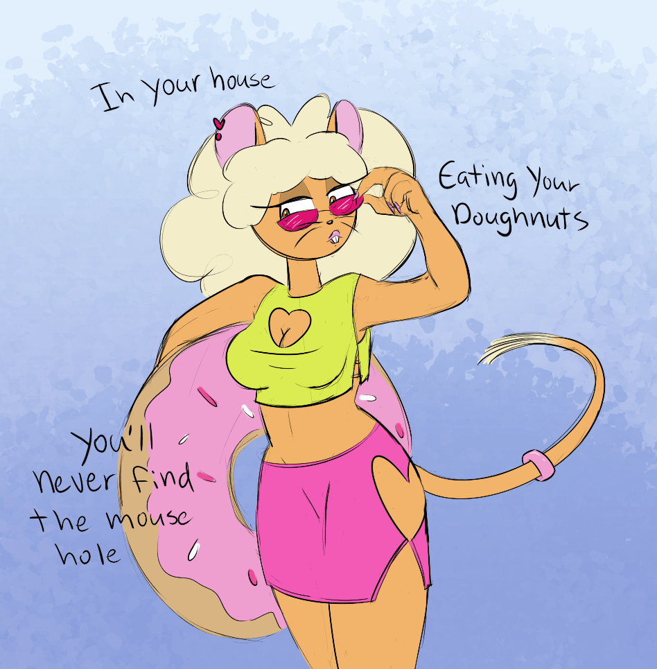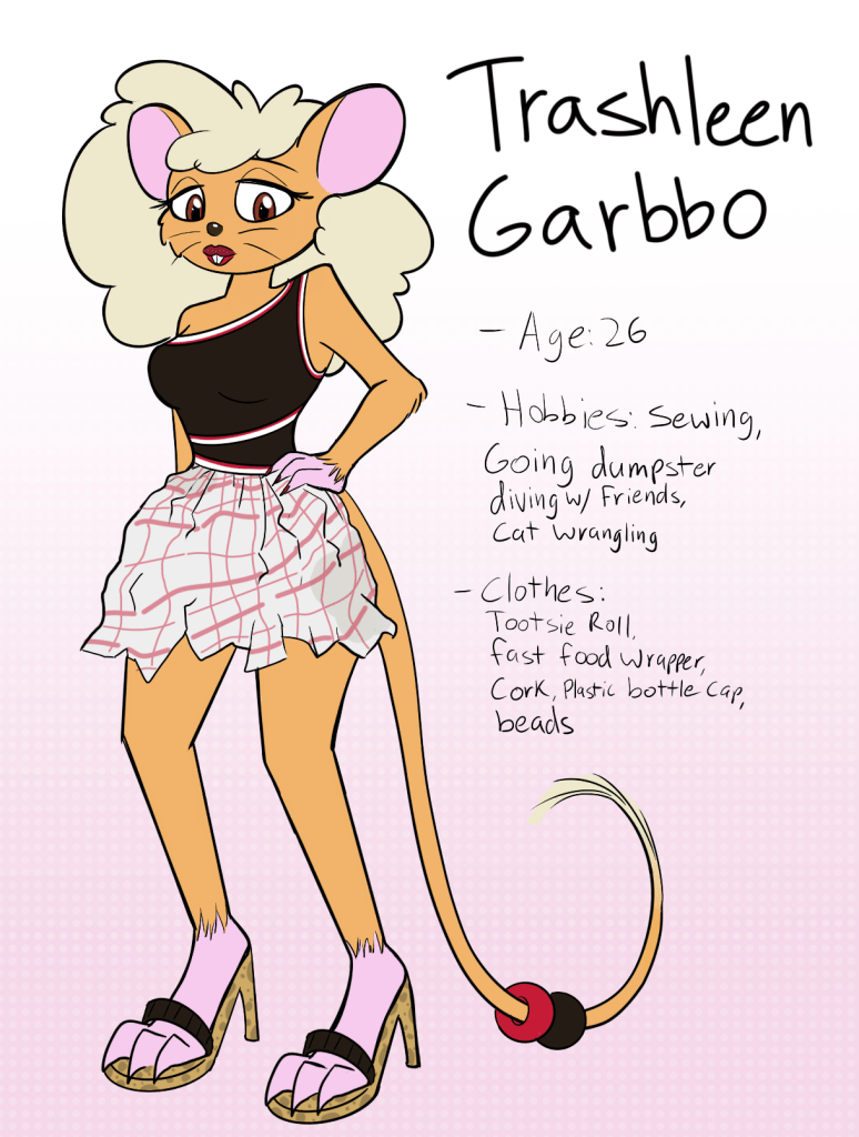 Trashleen is an aspiring fashion designer. She will do whatever it takes to reach her goals, including making her clothes out of actual garbage. Her height varies, it depends on what fandom she’s in. She can be rat sized or human height.
